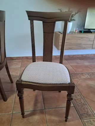 Elegante silla de comedor con asiento tapizado. - Estructura de madera de roble. - Diseño clásico con respaldo curvo. - Asiento con tapicería de tela en color claro. Mesa de madera maciza de roble con medidas de 90x160 + 20cm de extensión Mesa y sillas pueden ser vendidas por separado Precio negociable