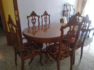 Mesa de madera clásica 1,60x98 cm de alto 75cm y 6 sillas a juego alguna de ellas está para cambiarle el acolchado y coserle algún ribete.