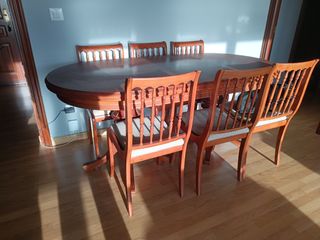 Conjunto de mesa de comedor de madera maciza y seis sillas a juego. La mesa es extensible (1 m) Las sillas tienen asientos acolchados con un delicado ribete. Muebles clásicos en color marrón, ideales para un salón elegante. El precio es por la mesa con las sillas, se puede vender individual,la mesa sola 60 euros y cada silla 10