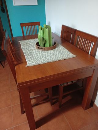Conjunto de mesa de comedor extensible y cinco sillas a juego. Con algún roce de uso pero en buen estado. Recogida en Ferrol. - Mesa de madera con acabado en cerezo. - Sillas de madera con respaldo de listones.