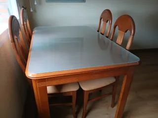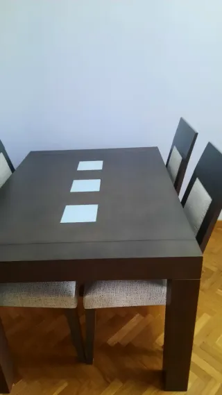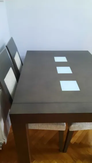 Conjunto de mesa de comedor extensible con cuatro sillas. - Mesa con detalles de cristal en la superficie. - Sillas con asientos tapizados. Tiene algún defecto pero muy pequeño. La mesa extendida 1,80 m y cerrada 1,20. Se vende también x separado