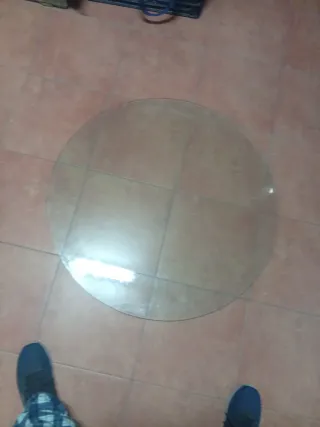 Tablero de cristal circular para mesa. Bastante grueso y de gran calidad. No tiene muescas en el borde ni rallajos apreciables. Canteado según foto. Ideal para renovar o complementar tu mobiliario. - Diámetro: 85 ctm - Grosor: 10 mm