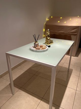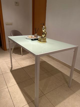 Conjunto de mesa de comedor y cuatro sillas. Estan prácticamente a estrenar. No tienen casi uso, no tiene marcas, ni nada. Estan perfectas. - Mesa con patas blancas y sobre de cristal. - Sillas tapizadas en simil piel blanco con estructura metálica.