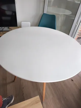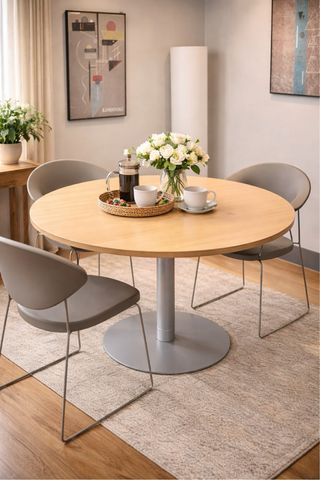 Mesa redonda de comedor con un diseño moderno y limpio. - Superficie lisa y fácil de limpiar. - Base estable para el uso diario.