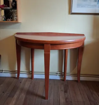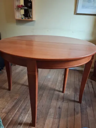 Vendo mesa redonda de comedor de madera maciza en buen estado. • Diámetro: 115 cm. Alto: 75 cm. • Material: Madera maciza con chapado de madera noble (aparenta ser caoba o nogal), acabado brillante. • Diseño clásico, con veta natural y detalles decorativos. • Sistema extensible (aunque no se incluye la pieza central para ampliar). • Ideal para comedor, cocina amplia o espacios de estilo vintage/tradicional. • Tiene algunas marcas de uso propias del tiempo, pero la estructura está muy firme y estable.
