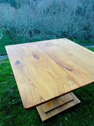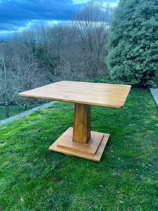 Mesa de comedor o auxiliar cuadrada, de madera, estilo pedestal. En buen estado, sólida y robusta. CONSULTAR POSIBILIDAD DE TRANSPORTE - Tablero y pedestal de madera de castaño - Base de pedestal de madera de pino.