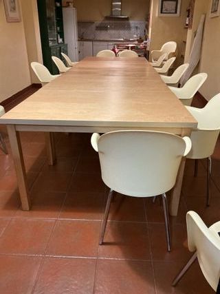Mesa de comedor . - 120 cm de largo x 87 cm de ancho, cerrada y 233cm de largo abierta. - Mesa de madera clara maciza.Hay 4 sillas a juego en mi perfil. Tiene marcas del uso en la tapa superior Durante el mes de FEBRERO.