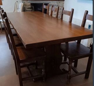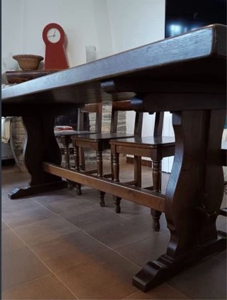 Mesa de comedor robusta y elegante, fabricada en roble macizo. - Diseño clásico y atemporal. - Base de mesa sólida y estable. - Acabado natural que resalta la veta de la madera. Magnifica mesa de comedor de roble macizo de carpinteria artesanal La mesa dispone de dos soportes en ambos extremos con travesaño. El sobre de la mesa tiene siete cm de grosor Esta impecable, muy cuidada y apenas sin utilizar. La mesa esta en Arnedo, La Rioja. el transporte será a cargo del comprador.