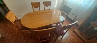 Conjunto de mesa de comedor y 4 sillas,la mesa mide cerrada 110 cm de diámetro y abierta 150x 110 y 70 de alto,es de madera noble,y 4 sillas ,todo en buen estado , posibilidad de transporte gratis a zonas cercanas,se pueden vender juntas o por separado 60 euros la mesa y 60 euros las 4 sillas,todo el conjunto 100 euros