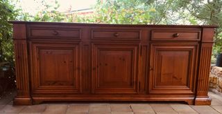 - Mesa de comedor de madera: Nogal Español: Madera noble, dura y de gran belleza en su veteado, utilizada tanto en macizo como en chapas y tablillas para muebles de alta calidad. - Dos sillones con brazos y cuatro sillas de Nogal español con asiento de Enea - Mueble aparador a juego.