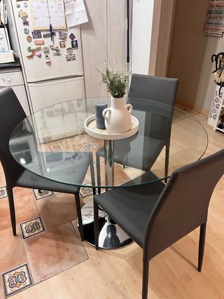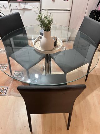 Conjunto de mesa redonda, es extensible, con sobre de cristal (o no) y cuatro sillas acolchadas de madera.