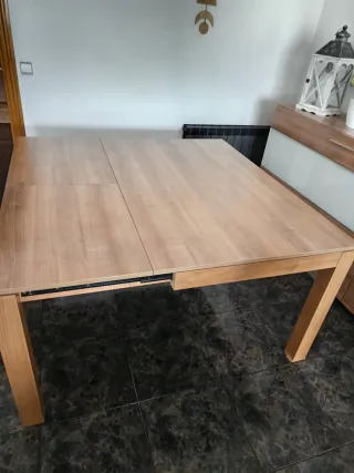 Mesa extensible de IKEA, de madera con patas negras. Ha sido usada durante 2 años y se encuentra en buen estado, con solo un pequeño golpe poco visible. Su precio original en IKEA fue de 500 €. Ideal para comedor o salón, ya que al ser extensible permite adaptarse fácilmente cuando necesitas más espacio.