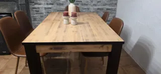 Elegante mesa de comedor con superficie de madera y patas oscuras. - Diseño moderno y funcional. - Combina materiales de calidad para un acabado duradero. -medidas 140×90 extensible 180x90. -muy bien conservada -venta por canvio modelo.