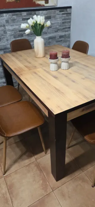 Conjunto de mesa de comedor con cuatro sillas. - x1 Mesa con tablero de madera clara. Mesa que se abre. - x2 Sillas de color marron (perfecto estado). - x2 Sillas de color blancas (usadas) Lo tenía en mi época de soltero y me cambiado de muebles al haberme cambiado de vivienda. (3 años desde la compra). Solo usaba una silla que la usaba de escritorio de ordenador, la mesa ni se ha usado a penas.