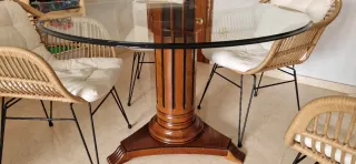 Elegante mesa de comedor de madera . Incluye cristal. - Forma redonda y se convierte en ovalada. - Patas torneadas. - Extensible.