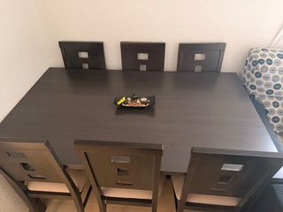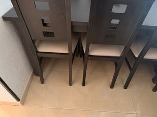 Mesa de comedor extensible con un diseño elegante. Incluye 6 sillas. - Acabado en madera oscura. Buen estado. - Tapicería de las sillas en tela. Las sillas se encuentran en condiciones regulares. - Capacidad para 4-6 personas. Disponible a finales de Marzo (2026).