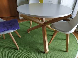 Mesa redonda extensible (+45) de madera lacada en blanco. Está en perfecto estado, como nueva! El precio de la mesa son 250€. Las sillas de madera y lacadas con mucho gusto, se pueden vender por separado o en conjunto. El precio de cada silla son 50€. Sólo mesa 250€. Precio de mesa +sillas 430€