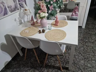 Mesa de comedor con un diseño moderno y elegante. Esta pintada de blanco, su color original es wengue. Tendría falta de una manita de pintura y quedaría como nueva. No tiene desperfectos - Patas de madera. - Tablero de plástico blanco.