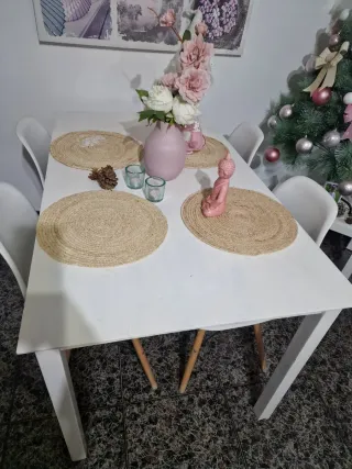 Conjunto de mesa con cuatro sillas. Vendo mesa con cuatro sillas totalmente nueva. La quito porque no la uso. Se vende tal cual está, con el camino de mesa, el centro de mesa y las almohadillas de las sillas. Su medida es de 1,20 cm de largo y 71 cm de ancho.