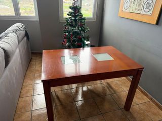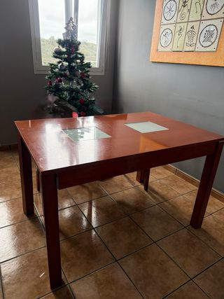 Mesa de comedor extensible. Está desgastada por el uso, por eso he puesto un precio simbólico. - Tablero de madera con inserciones de cristal. - Patas de madera robustas.