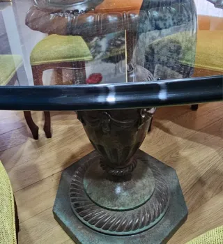 Elegante mesa de comedor con superficie de cristal y base de resina tallada. - Diseño único y detallado. - Base con acabados intrincados. - Cristal redondo grueso con a abajo pecho paloma de 110cm (ver detalle en foto). - Detalle de las medidas en la última foto. - Se venden las 6 sillas que aparecen en la foto por 540€ si se compra el conjunto se puede negociar un precio especial.