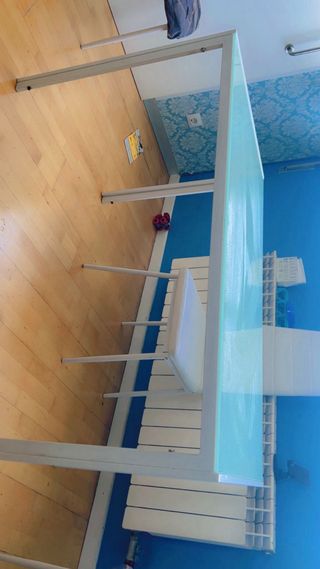 Elegante mesa con superficie de cristal y estructura de metal. - Diseño moderno y minimalista. - Combina a la perfección con cualquier decoración. Tengo 3 sillas que las regalo porque tienen desperfectos.