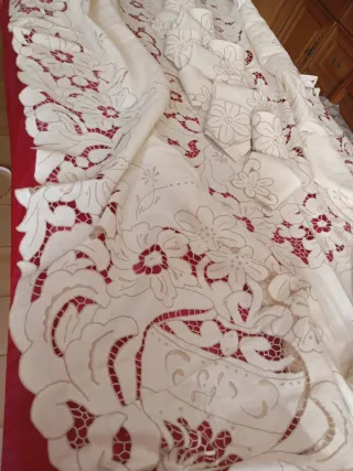 Preciosa mantelería muy grande antigua con un delicado bordado hecho a mano. Un tesoro para tu mesa. Con la técnica ricamado y que queda en relieve la más antigua también con encaje de aguja nueva nunca se a usado pero muy antigua más de 100 años sinceramente de lo que ya no ay también con filtire espetacular. - Diseño floral y detalles calados. - Adornos de encaje en el borde. - Patrón de pequeños puntos en la tela. Mide 3,60 x 2 metros