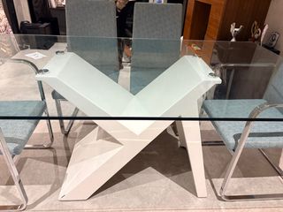 Elegante mesa de comedor con un diseño moderno y limpio. Combina a la perfección con cualquier estilo de decoración. - Tablero blanco brillante. - Inserciones de cristal en la superficie. - Patas robustas. - 6-8 plazas - lleva un pequeñito quemado