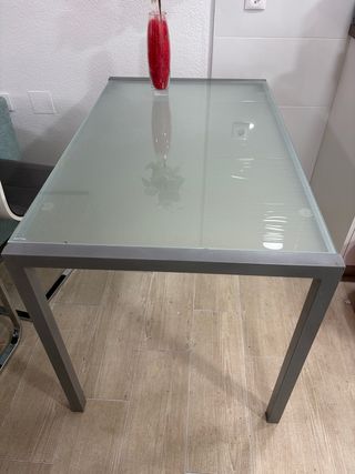 Bonita mesa de salón con cristal templado y estructura metálica. Solo 6 meses de uso, se rompio el cristal que tenia y se cambió por otro mas reforzado y nunca mas se volvió a usar. 6-8 personas No se incluyen sillas. Precio algo negociable Se podría entregar en Caravaca(Murcia) o Molina(Murcia) Solo en mano.