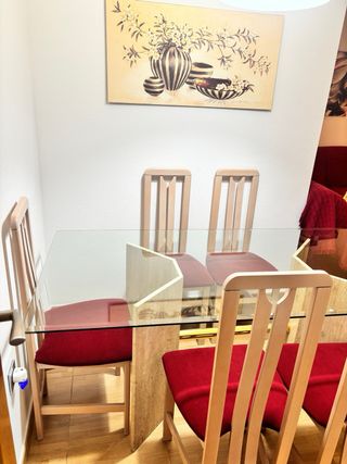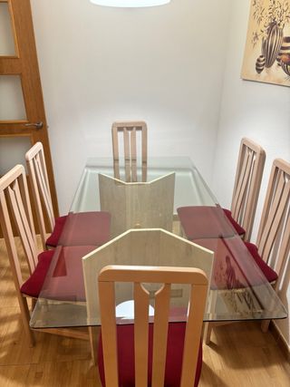 Conjunto de mesa de comedor con sillas. - Mesa de madera clara. - Incluye 8 sillas, con opción a 6 (restando 40 euros, 20 por silla). La mesa más 6 sillas quedaría en 200 euros. La mesa sale por 80 euros (tiene una marca de un quemado, de ahí su precio).