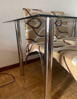 Elegante mesa de comedor con superficie de cristal y estructura de metal. - Diseño moderno y atractivo. - Combina a la perfección con cualquier estilo de decoración. Se vende junto a sus 4 sillas No sé envia