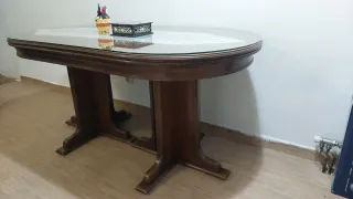 Elegante mesa de comedor extensible con un diseño clasico y funcional. Perfecta para cualquier hogar. Medie 165cm por 80cms . Extiende dos tramos laterales 45cm cada uno. - Tablero de madera y con cristal protector. - extensible hasta casi el doble de su tamaño - Base de madera oscura. - Diseño ovalado.