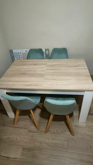 Conjunto de mesa de comedor con cuatro sillas. - Mesa comedor extensible - Acabado en Color Blanco Artik y Roble Canadian - Medidas: 140-190 cm (Largo) x 90 cm (Ancho) x 78 cm (Alto) - Sillas terciopelo color verde agua con patas de madera de Maison du Monde Se puede ver sin compromiso