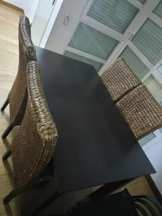 Conjunto de mesa de comedor extensible con cuatro sillas. - Mesa con superficie oscura. - Sillas de ratán tejidas.