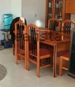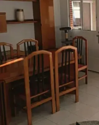 Muebles de salón de madera en buen estado. - Mueble principal con espacio para TV. 3,30 x 1,96 x 0,45 m - Meda centro 1,0 x 0,32 m - Librería 1,2 x 0,32 m - Mesa comedor 1,58 x0,9 m - 6 sillas tapizadas Las sillas están enganchadas por la gata Y algún roce llevan los muebles. El mueble de al lado de la vitrina las puertas de arriba y abajo no se mantienen abiertas,se han roto las visagras No se hace envío Trato en persona