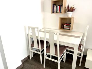 Conjunto de mesa blanca de IKEA con cinco sillas. - Mesa de comedor blanca MELLTORP (descatalogada en IKEA, mesa más exclusiva). - 4 sillas blancas a juego modelo TEODORES y una silla blanca plegable modelo GUNDE (descatalogada) Sólo venta en persona.