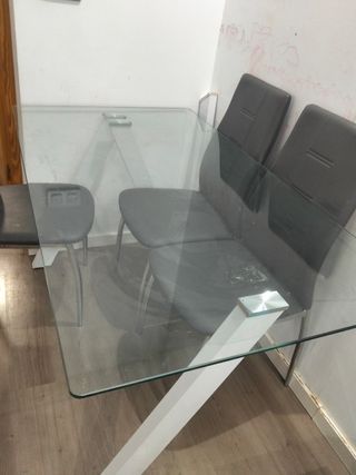 Conjunto de mesa de comedor con superficie de cristal y cuatro sillas a juego, solo una previsión, tiene una pata algo fastidiada, pero solucionable y extensible, la mesa. - Diseño elegante y moderno. - Estructura de madera robusta. - Tablero de cristal transparente.