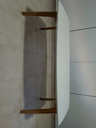 Mesa de salón blanca 1'80x0'70 patas de madera. Algunos roces poco visibles en las patas, el cristal está como nuevo Se vende porque me ocupa mucho espacio y no la uso