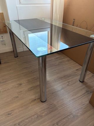 Elegante mesa con superficie de cristal y patas de acero cromado. - Diseño moderno y versátil. - Ideal para comedor u oficina. - Acabado brillante.