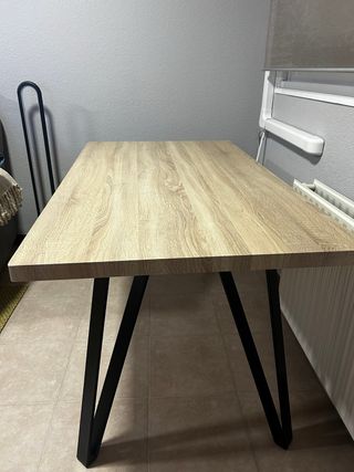 Mesa con un diseño moderno y funcional. - Tablero de madera con veta natural. - Patas de metal en forma de V.