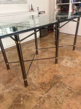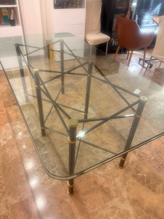 Vendo mesa de comedor elegante y moderna con tablero de cristal templado de 15 mm de grosor. Medidas: 183 cm de largo x 95 cm de ancho. Estructura metálica robusta en color oscuro con detalles en acabado dorado. Muy estable gracias a los refuerzos inferiores. Mesa amplia, ideal para 8 personas. El cristal templado de 15 mm grueso le da gran resistencia y una presencia elegante. En buen estado. Tiene algunos arañazos por roce de zapatos pero la mesa es espectacular y tu comedor tendrá un aspecto moderno y dará amplitud al espacio