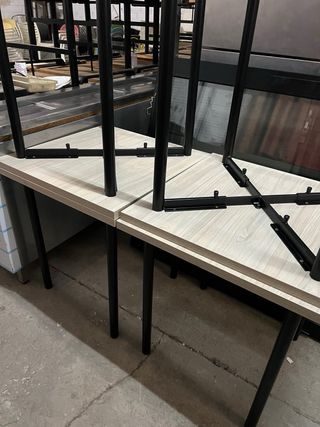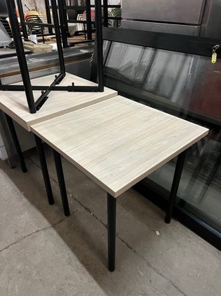 11 mesas auxiliares con un diseño moderno. 70€/u, 700 si te las llevas todas. - Tablero de madera color olmo. - Patas metálicas negras.