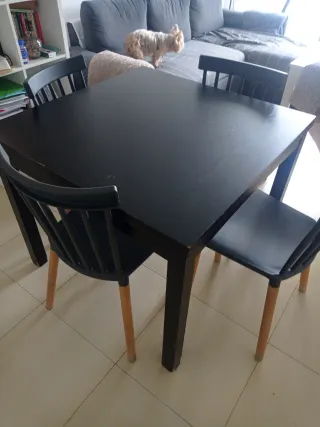 - Mesa modelo Lisabo en color negro (medidas en imagenes). - Cuatro sillas en color negro modelo Stefan. - Cuatro cojines modelo Justina en color azul grisáceo. (La mesa la tengo guardada por razones de mudanza, si os interesa el estado puedo enviar fotos sin problema). Precio algo negociable