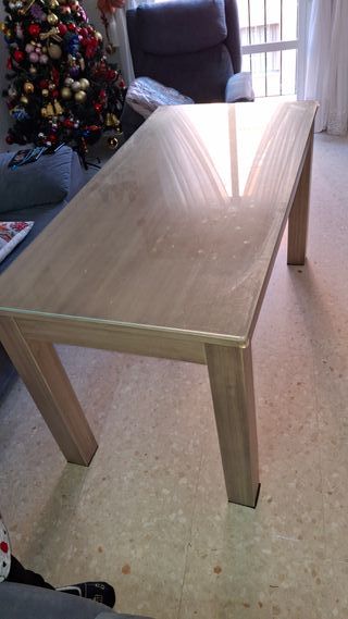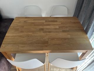 mesa de madera en perfecto estado. barniz natural. apenas tiene uso grosor: 4cm largo: 160cm altura: 75cm (patas 71cm) ancho: 80cm Tambien se venden pack 4 sillas NO INCLUIDAS EN EL PRECIO por 130e