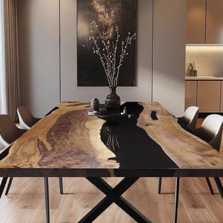 Espectacular mesa de río nueva a estrenar, 4,5 cm de grueso de madera maciza noble, río de resina epoxica negra y acabado al aceite sedoso. una mesa de alta decoración para ser el epicentro de tu comedor. tamaño de 200 x 90 cm , un tamaño ideal para sentar hasta 8 comensales cómodamente.