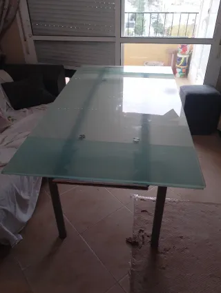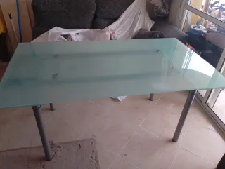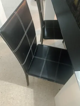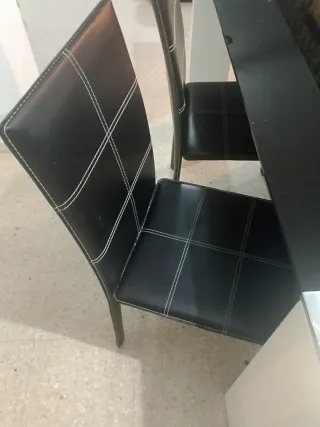 Se vende está mesa elegante en magnífico aspecto,(practicamente nueva)el cristal es bien gordito y resistente, las patas están forradas también del mismo materias de los sillones de las sillas lleva a conjunto las 4 sillas forradas de imitación a cuero(material de scay) es perfecta tanto para su hogar o u Oficina,precio algo negociable, pregunten sin compromiso