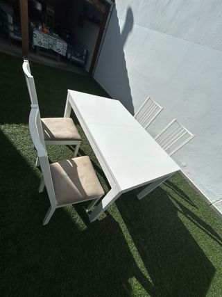 Mesa de comedor con un diseño moderno y funcional. - Algún signo de uso pero no tiene golpes grandes ni esconchones. - Extensible. hasta 8 comensales. - Acabado en color blanco. - Estructura de madera. - 6 sillas con tapicería en beige. - MEDIDAS: 1’40 largo, 0’84 ancho, 0,75 alto. SE PUEDE VER EN PERSONA NO HAGO ENVÍO