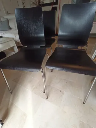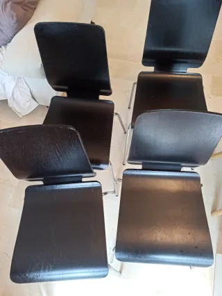 Conjunto de mesa de comedor extensible con cuatro sillas . El diseño muy funcional ya que se puede recoger y ocupar poco espacio. - Sillas de madera oscura. - Patas de las sillas de metal cromado. Medidas mesa : 90 ancho , 77 alto y de largo ( 51 , 97'5 , 144 , 190'5 , 237 ). Se puede vender por separado.