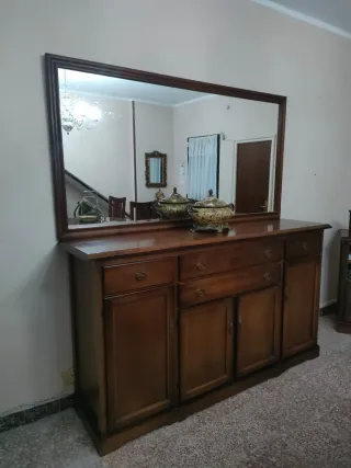 Muebles de salón. - 5 x Silla de comedor de madera y asiento tapizado con estampado floral. - 1 x mesa camilla redonda grande con patas y tablero de madera + cristal (2 telas invierno y verano) - 1 x aparador de 4 puertas con espejo del mismo tamaño (foto) - 1 x mueble de entrada con cajón - 1 x mueble para la televisión También se puede hablar precio individual.