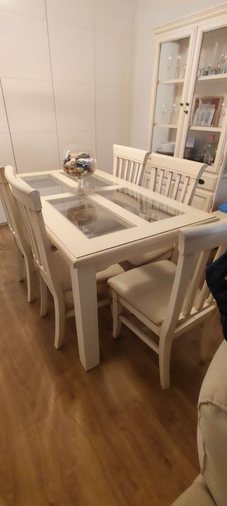 Mesa extensible y 6 sillas para salón con su tapa de cristal También tengo el espejo con su marco aparte opcional .No lo puedo revajar más